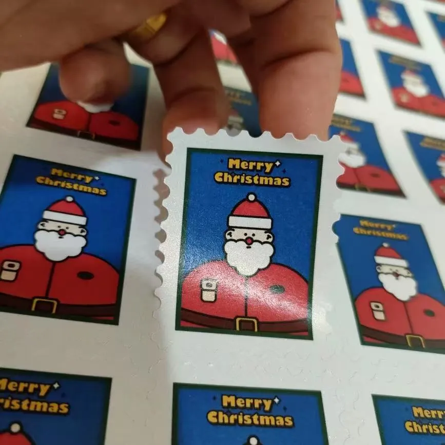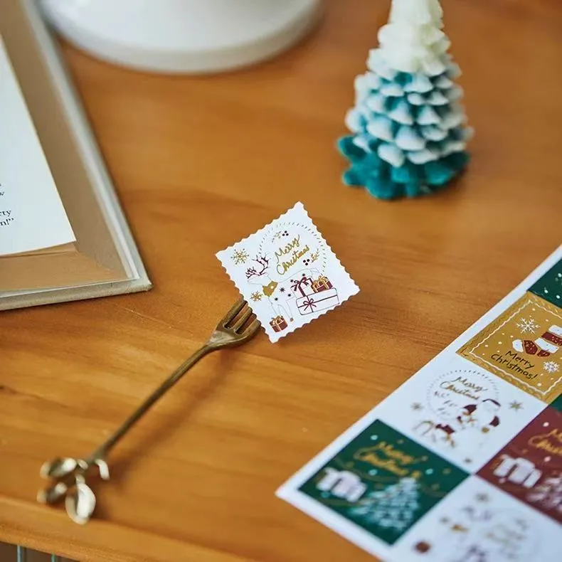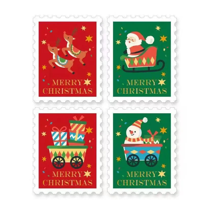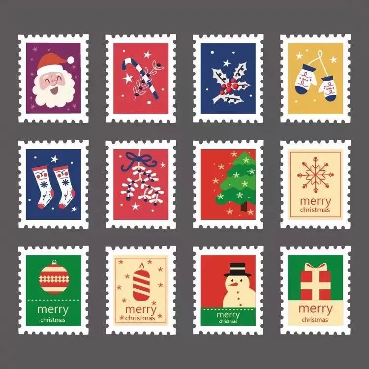 Nativitatis stamp Libelli Jojo Pack Feature a Retro christmas card sicut background, showcasing variis stamp-style stickers. In marginibus habere perforatum effectum, dare a classic et desiderium vultus.