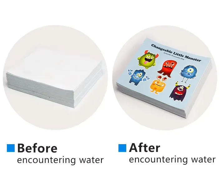 Cum aqua immergitur, statim in crustulum statum revertitur et celeriter discutit. Colores impressi tunc diffunduntur ac deformantur. Processus color mutabilis irrevocabilis est. Postquam expositus est aqua, colorem perpetuum ostendet.