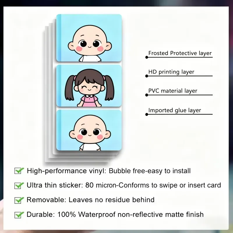 Fidei card operculum stickers card superficiem ab fricationibus, scuffs et abrasionibus minoribus tueri, adiuvans ad conservandam condicionem chartae et claritatem informationis impressarum, sicut numerus chartae, dies expiratus et nomen possessoris. Nonnulli etiam Libelli possunt etiam contra humum et umorem aliquem gradum munire.