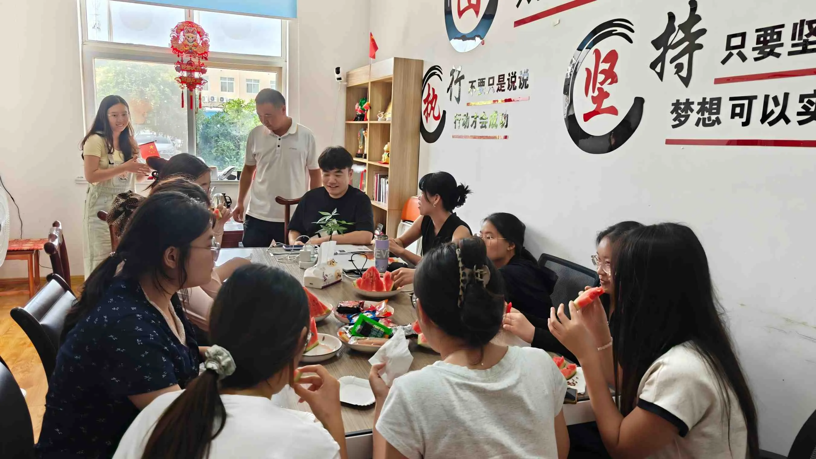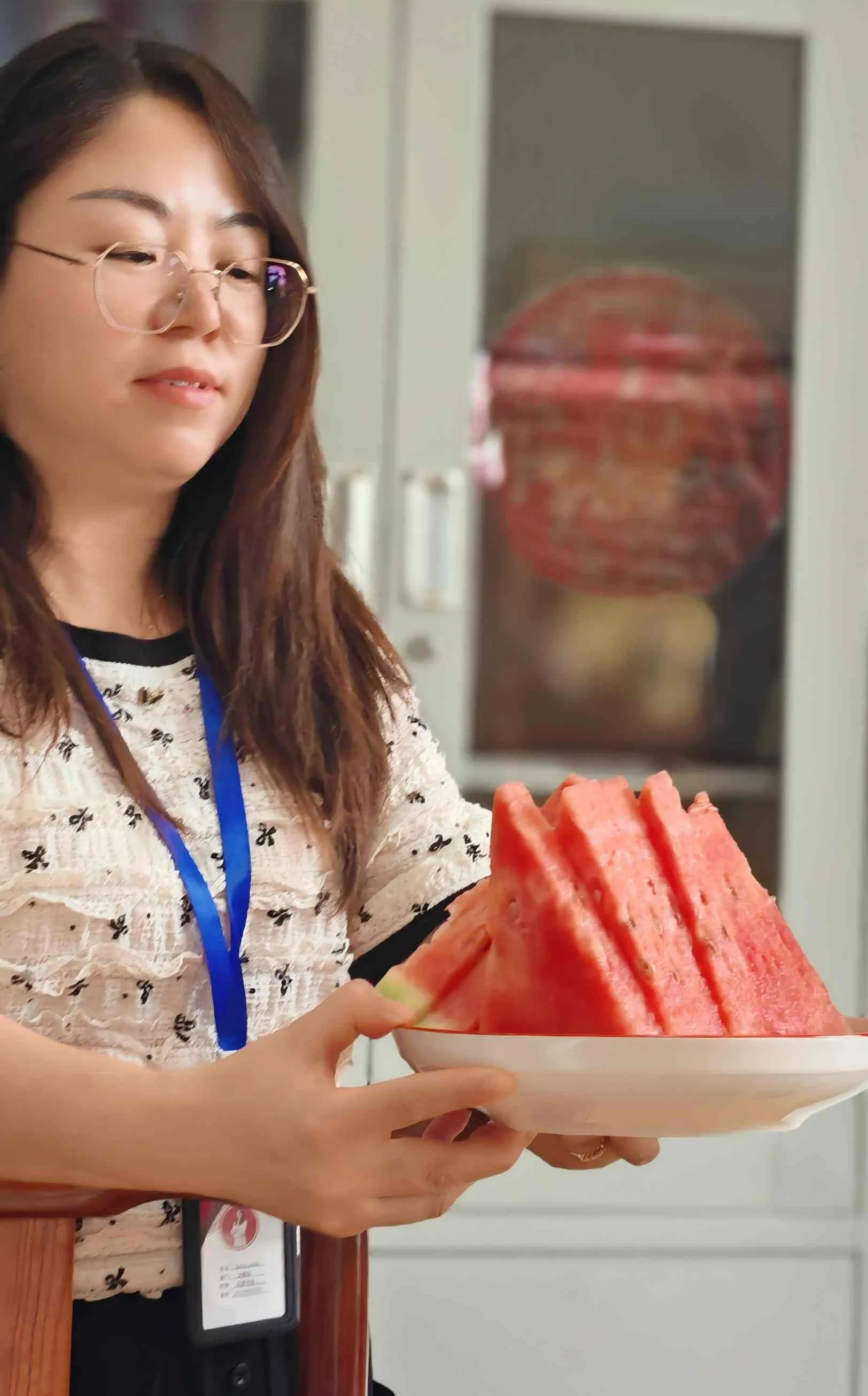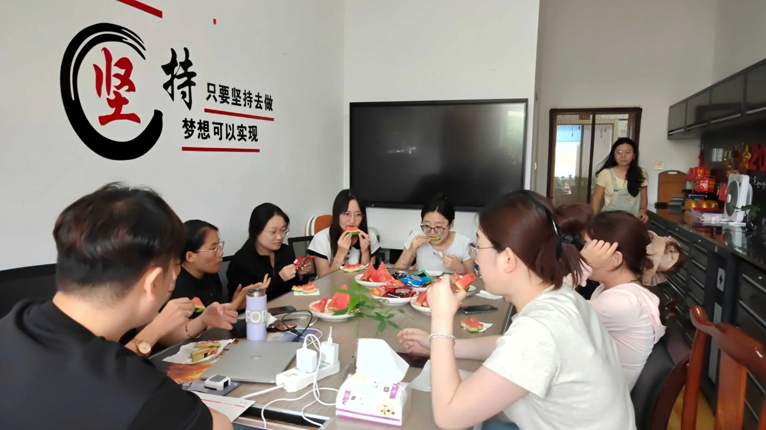 In eventu site varietate snacks sunt eleganter proponendum, vndique a CALAMISTRATUS nuces, dulcis arida fructus variis exquisita arte. Et dives et diverse snacks occurrit diversis gustum preferences omnium. Et maxime oculi-apprehensa item fuit recens capta-de Big PEPON ex armario frigidario. Viridis cutis PEPO erat involutus circa rubeum caro et quod abscissus aperto sucus effuderit et dulcis odorem unda. Factus est maxime popularibus "refrigerationem tool" in calidum aestate. In employees sedit in coetus, tenentes in PEPON in manibus et gustando in snacks et solvit fabulamur vocibus et hilaris risus sunt semper orientem et procidens. Totius officii regio impleta est aeris gaudii.