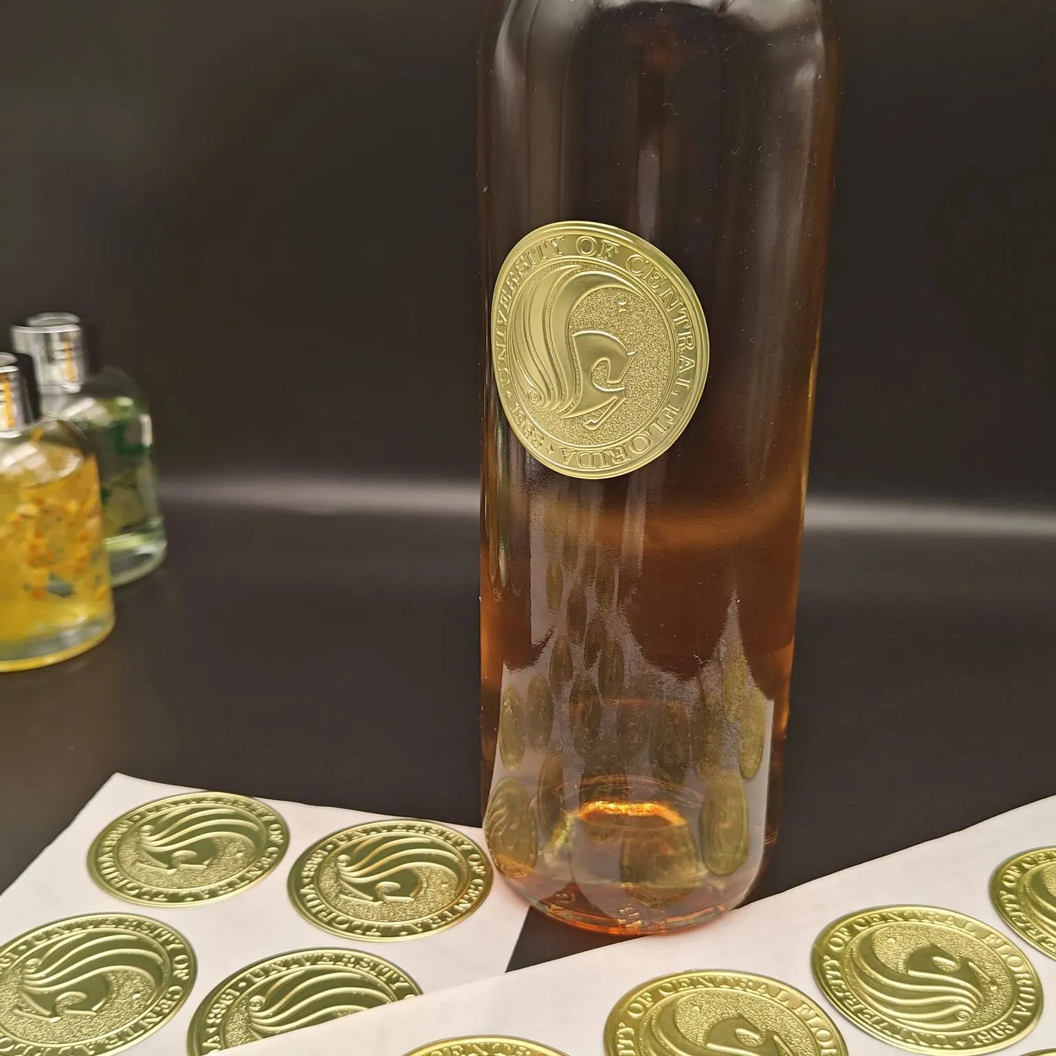 Labium rotundum pittacium vini insculptum est titulus sui tenaces cum basi circulari, ubi foil metallicus transfertur in superficiem materialem per technologiae calidae impressae, et deinde exemplaria impressa impressa sunt utentes formae concavae convexae. Sicut exiguum numisma, metallicus splendor et sensus trium dimensionis tangendi pittacii statim sensus premium totius amphorae vini semel ad utrem corpus appositum sensim elevare potest.